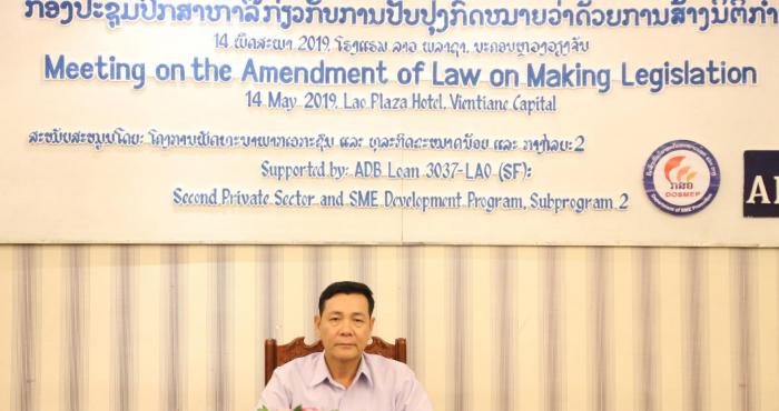 ຕອນເຊົ້າວັນທີ 14 ພຶດສະພາ 2019 ຢູ່ທີ່ ໂຮງແຮມລາວພລາຊາ ໄດ້ຈັດກອງປະຊຸມປຶກສາຫາລື ປັບປຸງກົດໝາຍວ່າດ້ວຍ ການສ້າງນິຕິກຳ ຂຶ້ນໂດຍການໃຫ້ກຽດເຂົ້າຮ່ວມເປັນປະທານຂອງ ທ່ານ ປອ ເສີມສຸກ ສິມພະວົງ ຮອງລັດຖະມົນຕີກະຊວງຍຸຕິທຳ, ຜູ້ເຂົ້າຮ່ວມມີຫົວໜ້າກົມກົດໝາຍກະຊວງຍຸຕິທຳ, ຮອງກົມ, ຜູ້ຕາງໜ້າຈາກສະພາແຫ່ງຊາດ, ຫ້ອງວ່າການປະທານປະເທດ, ຫ້ອງວ່າການສຳນັກງານນາຍົກ, ຜູ້ປະສານງານໂຄງການ ພ້ອມດ້ວຍຄະນະຮັບຜິດຊອບຈຳນວນ 15 ທ່ານ, ຍິງ 3 ທ່ານ. ຈາກນັ້ນ, ທ່ານປະທານກອງປະຊຸມ ກໍໄດ້ມີຄຳເຫັນ ແລະ ຄຳໂອ້ລົມ ຕໍ່ບັນດາທ່ານທີ່ເຂົ້າຮ່ວມກອງປະຊຸມໃນຄັ້ງນີ້ ຈົ່ງພ້ອມກັນປະກອບຄຳຄິດຄຳເຫັນໃສ່ກົດໝາຍວ່າດ້ວຍ ການສ້າງນິຕິກຳ ເພື່ອປັບປຸງເຮັດໃຫ້ເນື້ອໃນມີຄວາມສອດຄ່ອງ ແລະ ຖືກຕ້ອງ, ຊັດເຈນກັບສະພາບຄວາມເປັນຈິງ ແລະ ມີຄວາມເປັນເອກະພາບກັນໃນການຈັດຕັ້ງປະຕິບັດໃຫ້ມີປະສິດທິພາບ ແລະ ປະສິດທິຜົນຍິ່ງຂຶ້ນ.