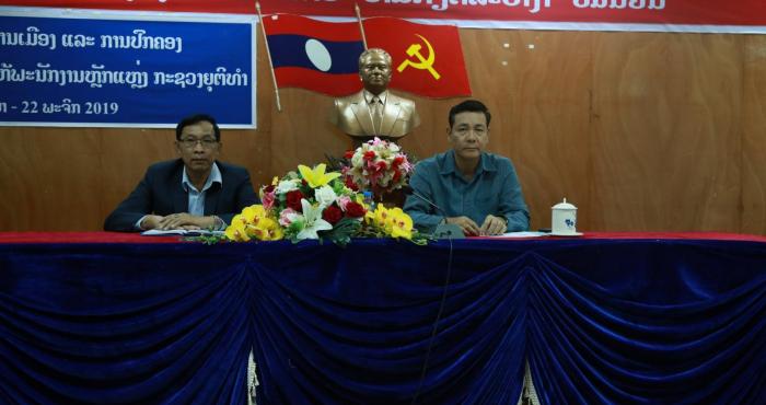 ຕອນບ່າຍຂອງວັນ 23 ກັນຍາ 2019 ຢູ່ຫ້ອງປະຊຸມຂອງກະຊວງຍຸຕິທໍາ ໄດ້ເປີດຊຸດຝຶກອົບຮົມທິດສະດີການເມືອງ-ການປົກຄອງ ໄລຍະສັ້ນ 45 ວັນ ຊຸດທີ Vlll ໃຫ້ແກ່ພະນັກງານຫຼັກແຫຼ່ງກະຊວງຍຸຕິທໍາຂຶ້ນ ໂດຍການໃຫ້ກຽດ ແລະ ເປັນປະທານຮ່ວມຂອງ ທ່ານ ປອ. ເສີມສຸກ ສິມພະວົງ ຮອງລັດຖະມົນຕີກະຊວງຍຸຕິທໍາ ແລະ ທ່ານ ຮສ ສະໝຸດທອງ ສົມພານິດ ຮອງຫົວໜ້າສະຖາບັນການເມືອງ-ການປົກຄອງແຫ່ງຊາດ, ມີຫົວໜ້າຫ້ອງການ, ຫົວໜ້າກົມ, ຮອງຫົວໜ້າກົມ, ຫົວໜ້າສະຖາບັນຍຸຕິທໍາແຫ່ງຊາດ, ຫົວໜ້າພະແນກ, ຄະນະຮັບຜິດຊອບຊຸດຝຶກອົບຮົມ, ນັກຝຶກອົບຮົມ ແລະ ແຂກທີ່ຖືກເຊີນເຂົ້າຮ່ວມທັງໝົດ ຈໍານວນ 58 ທ່ານ, ຍິງ 21 ທ່ານ.