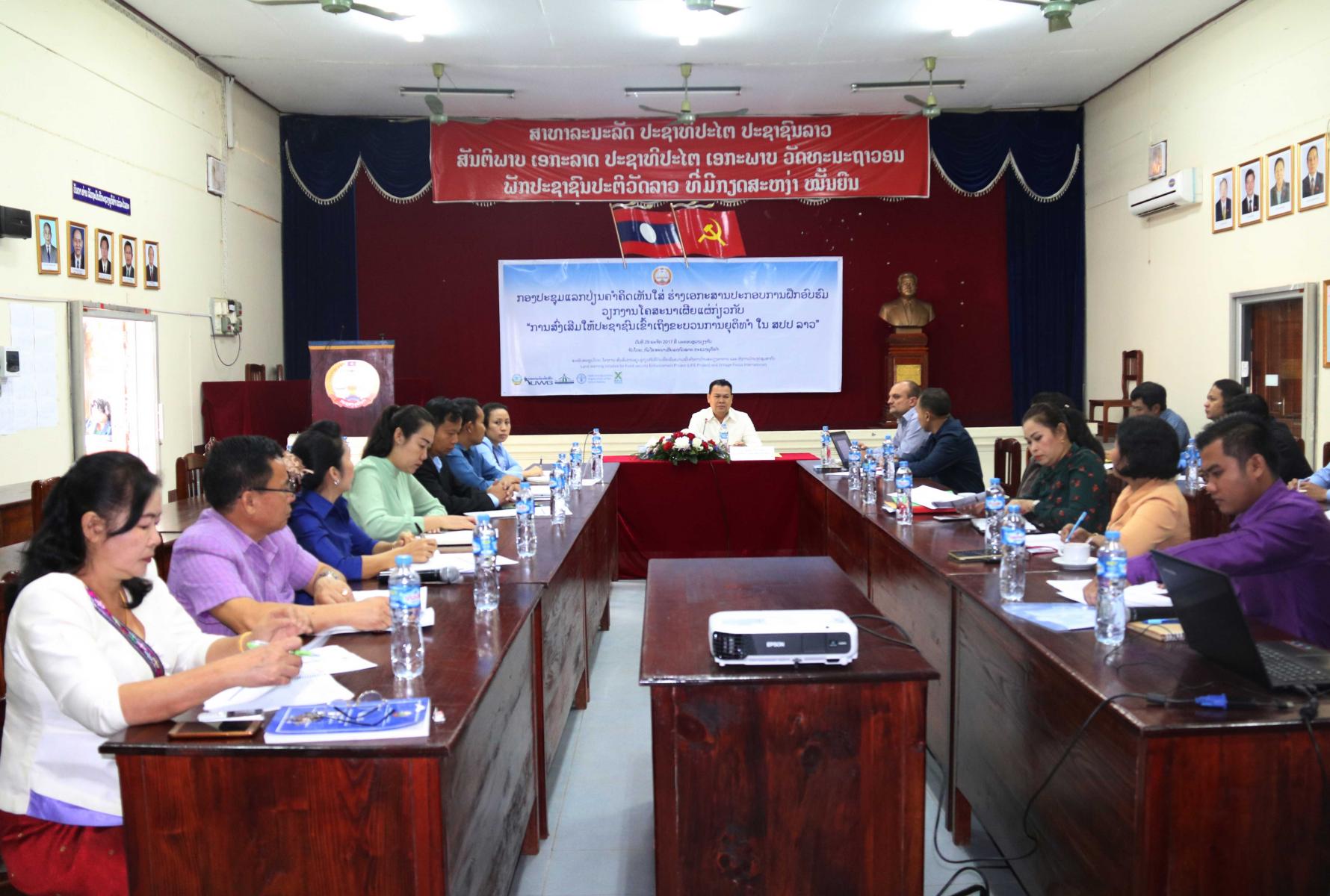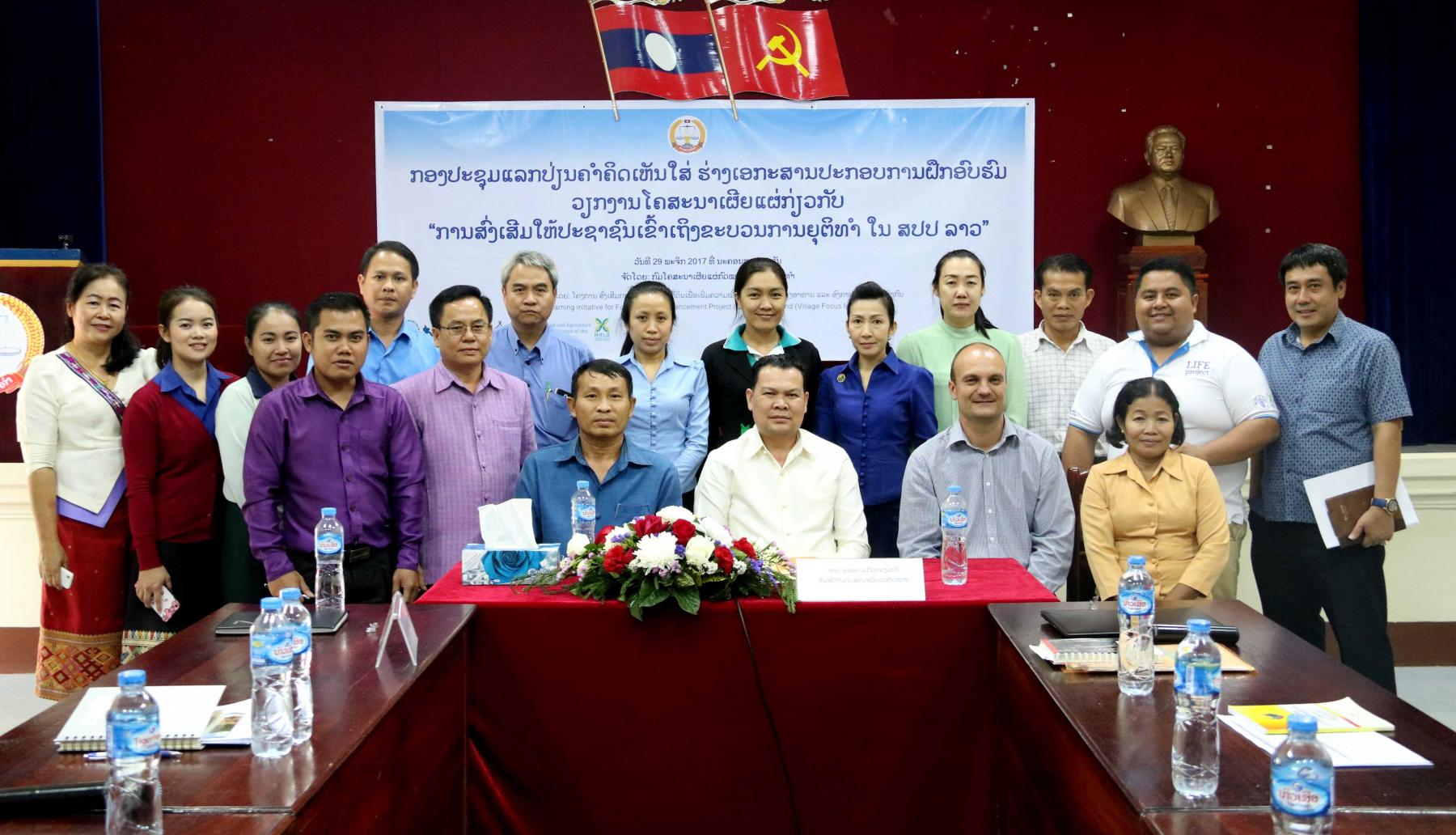 ກອງປະຊຸມດັ່ງກ່າວໄດ້ຈັດຂຶ້ນໃນຕອນເຊົ້າຂອງວັນທີ 29 ພະຈິກ 2017 ທີ່ ກະຊວງຍູຕິທຳ ພາຍໃຕ້ການເປັນປະທານຂອງ ທ່ານ ພູທອນ ແກ້ວດວງມະນີ ຄະນະບໍລິຫານງານພັກກະຊວງຍຸຕິທໍາ, ຫົວໜ້າກົມໂຄສະນາເຜີຍແຜ່ກົດ ໝາຍ, ເຂົ້າຮ່ວມມີຜູ້ຕາງໜ້າຈາກ ກົມສົ່ງເສີມລະບົບຍຸຕິທຳ, ສະພາແຫ່ງຊາດ, ກະຊວງຊັບພະຍາກອນທຳມະຊາດ ແລະ ສິ່ງແວດລ້ອມ, ອົງການໄອຍະການປະຊາຊົນສູງສຸດ, ສູນກາງສະຫະພັນກຳມະບານລາວ, ກົມສືບສວນ-ສອບສວນ ກະຊວງປ້ອງກັນຄວາມສະຫງົບ, LIFE Project, ຮອງຫົວໜ້າກົມ ຕະຫຼອດຮອດຫົວໜ້າພະແນກ-ຮອງພະແນກ ແລະ ວິຊາການທີ່ກ່ຽວຂ້ອງເຂົ້າຮ່ວມ.