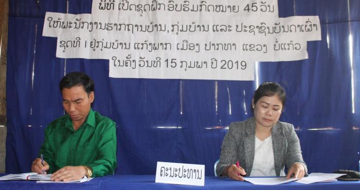 ໃນຕອນເຊົ້າວັນທີ 15 ກຸມພາ 2019 ຢູ່ທີ່ຫໍປະຊຸມບ້ານ ຫ້ວຍເເມງ ກຸ່ມແກ້ງພາກ, ເມືອງປາກທາ, ເເຂວງ ບໍ່ເເກ້ວ ໄດ້ຈັດພິທິເປີດຊຸດຝຶກອົບຮົມກົດໝາຍ 45 ວັນ ໃຫ້ພະນັກງານຮາກຖານບ້ານ, ກຸ່ມບ້ານ ເເລະ ປະຊາຊົນບັນດາເຜົ່າ ຊຸດທີ I ປະຈໍາປີ 2019 ຂຶ້ນ, ໂດຍການເປັນປະທານຮ່ວມຂອງ ທ່ານ ທ່ານ ຄໍາຫຼ້າ ອຸດທະຍອດ ກໍາມະການພັກເເຂວງ ຫົວໜ້າພະເເນກຍຸຕິທໍາເເຂວງບໍ່ແກ້ວ ແລະ ທ່ານ ນາງ ຈັນສຸກ ວັນນະວົງ ຄະນະປະຈໍາພັກເມືອງ ປະທານສະຫະພັນເເມ່ຍິງເມືອງປາກທາ, ມີບັນດາກໍາມະການພັກເມືອງ, ຫົວໜ້າຫ້ອງການ-ຮອງຫ້ອງການ, ເເຂກຖືກເຊີນ ເເລະ ຄູ-ຈານຕະຫລອດຮອດນັກຝຶກອົບຮົມເຂົ້າຮ່ວມທັງໝົດ 39 ຄົນ, ຍິງ 6 ຄົນ .