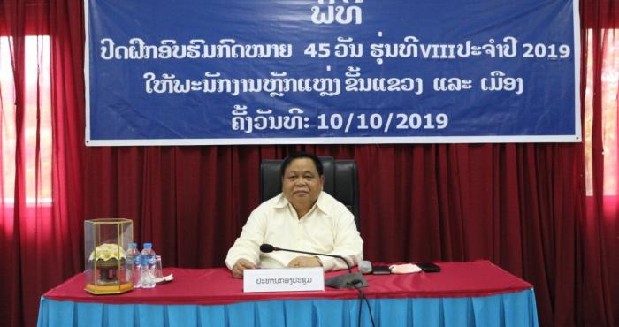 ໃນພິທິດັ່ງກ່າວ ທ່ານ ຄໍາບາງ ພະສະແຫວງ ເລຂາໜ່ວຍພັກຮາກຖານ ຫົວໜ້າພະແນກຍຸຕິທໍາແຂວງ ກໍ່ໃຫ້ກຽດຂື້ນຜ່ານບົດສະຫຼຸບຜົນສໍາເລັດການຝຶກອົບຮົມ ກົດໝາຍ ໄລຍະ 45 ວັນ, ຮຸ້ນທີ VIII ປະຈໍາປີ 2019, ໃນບົດສະຫຼຸບໄດ້ຊີ້ບອກໃຫ້ເຫັນວ່າ ມີຜູ່ເຂົ້າຮ່ວມຝຶກອົບໃນຄັ້ງນີ້ 43 ທ່ານ, ຍິງ 8 ທ່ານ, ດ້ານດີ, ດ້ານອອ່ນ ແລະ ພາກທິດທາງແຜນການ ໃນປີ 2020
